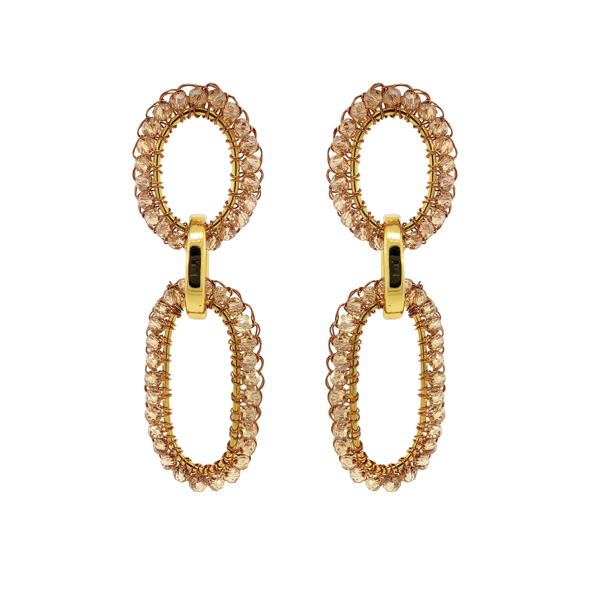 These hand-crocheted, multi links earrings were fabricated by skilled Brazilian artisans. The shiny crystals and gold wire is supplemental to the fine craft artwork spent in every piece of our jewelry. They feature enameled copper wire. Made from non-allergenic (hypoallergenic) and nickel-free materials. Stunning jewelry that will last for a lifetime. Each pair of earrings takes hours to finish. The result is a remarkable piece of jewelry. This piece is entirely handmade in Brazil.