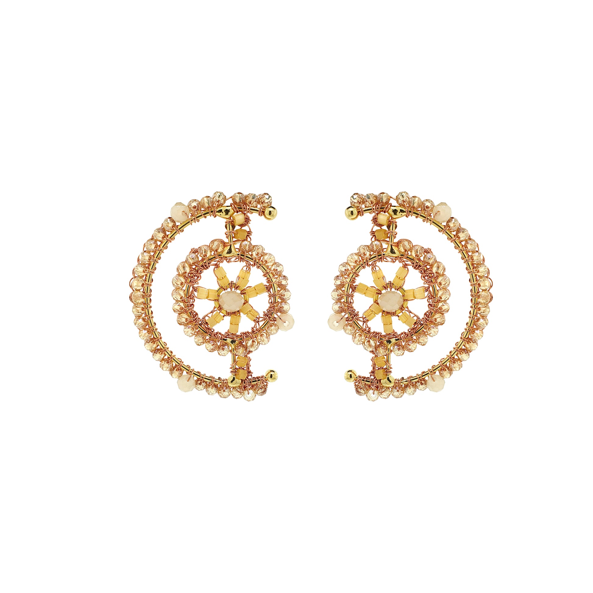 These striking handmade earrings are crafted by skilled Brazilian artisans using enameled wire and dazzling mix of crystals in amber and yellow tones. The intricate crochet design blends circular and geometric shapes, creating a modern and elegant statement piece. Lightweight, hypoallergenic, and nickel-free — these earrings combine craftsmanship, comfort, and timeless beauty. Stunning jewelry that will last for a lifetime.