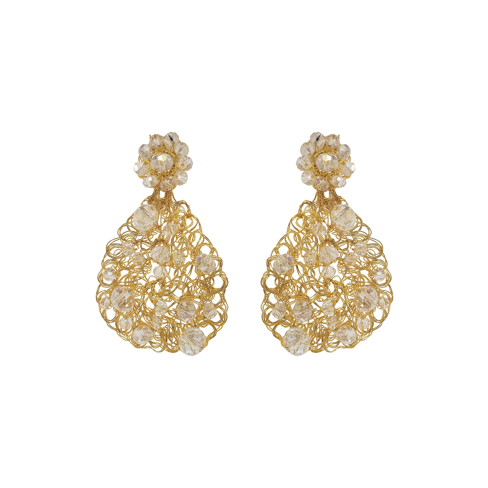 These teardrop-shaped, hand-crocheted mesh earrings were created by highly skilled Brazilian artisans. They feature shiny clear crystals and 18 karat gold filled copper wire creating a stunning look without the weight or bulk! They are light, comfortable, and can be worn on any occasion. The sparkling clear crystals complement the fine handiwork that can be seen in all of my jewelry. Made from hypoallergenic and nickel-free materials. Stunning jewelry that will last for a lifetime. This piece is entirely hand-crocheted, 18 karat Gold Filled wire, made in Brazil and includes a beautiful velvet bag.