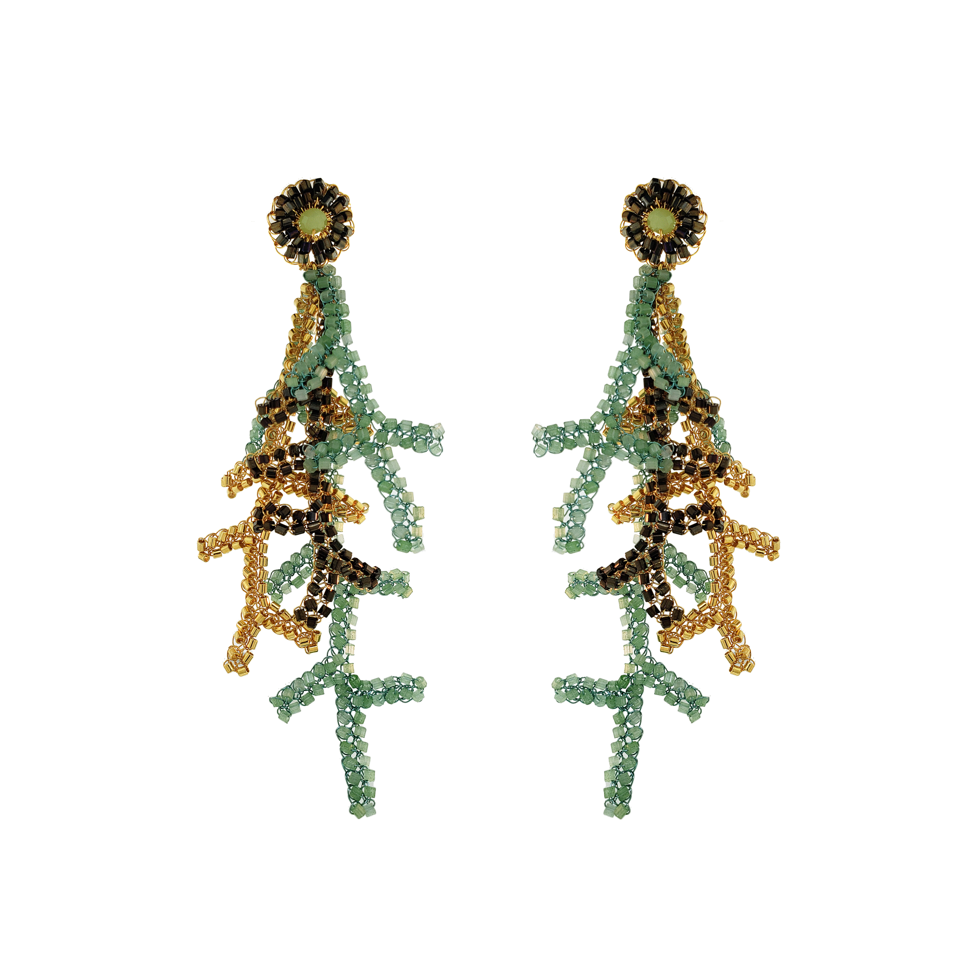 Long Green & Gold Mix Coral Branches Handmade Crochet Earrings