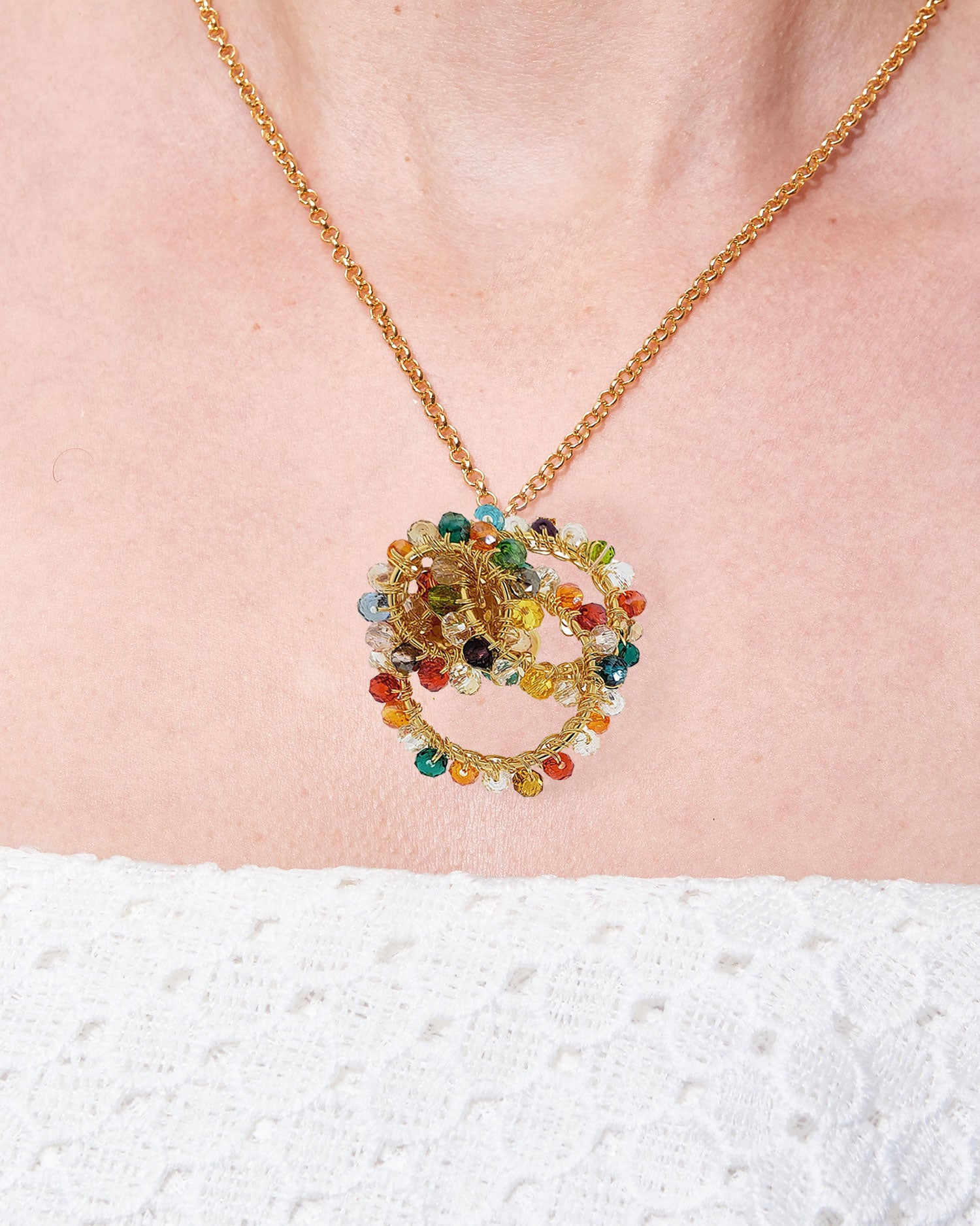 This geometric linked pendent necklace was fabricated by skilled Brazilian artisans. The sparkling multicolored crystals are supplemental to the fine craft artwork spent in every piece of my jewelry. Made from non-allergenic (hypoallergenic) and nickel-free material. Stunning jewelry that will last for a lifetime. Each piece of jewelry takes hours to finish. The result is a remarkable piece of jewelry.