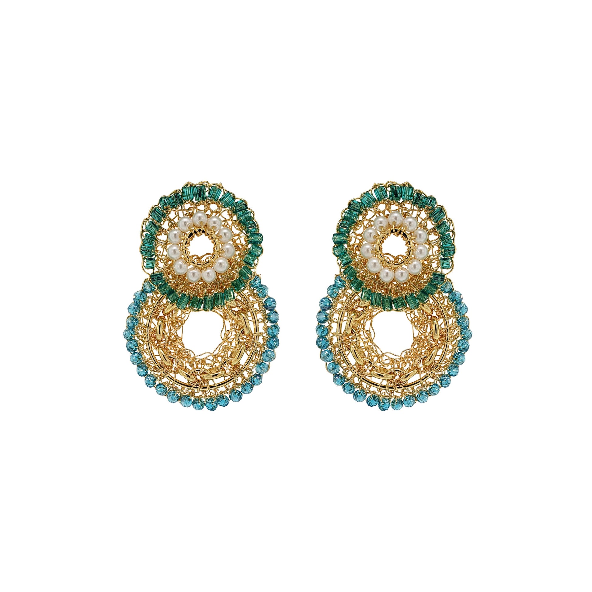 These handmade pieces are made of 18 karat gold filled copper wire with a gorgeous combination of shiny crystals stitched into a beautiful pair of earrings . Made from hypoallergenic and nickel-free materials. Stunning jewelry that will last for a lifetime.