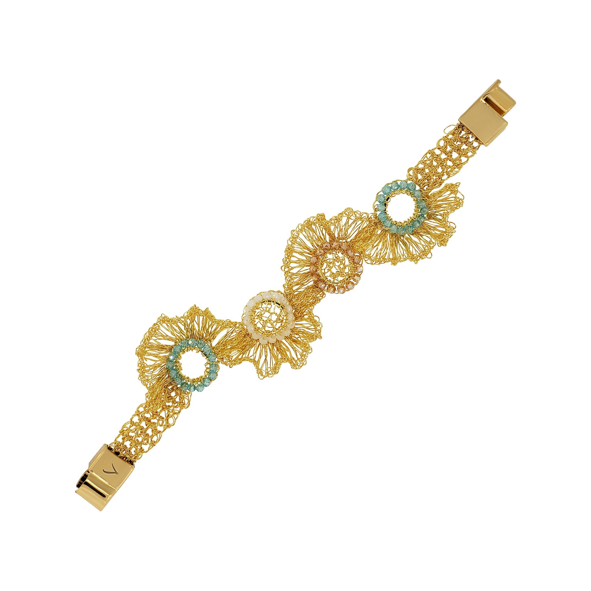 This modern hand-crocheted bracelet was fabricated by skilled Brazilian artisans. The 18 Karat Gold filled wire makes a statement without the weight or bulk and is complimented by sprinkles of shinny beads. They are light, comfortable, and can be worn on any occasion. Made from hypoallergenic and nickel-free materials. The magnetic clasp makes this bracelet easier to put on and take off. Stunning jewelry that will last for a lifetime. This piece is entirely hand-crocheted, 18 karat Gold Filled wire, made in Brazil and includes a beautiful velvet bag.