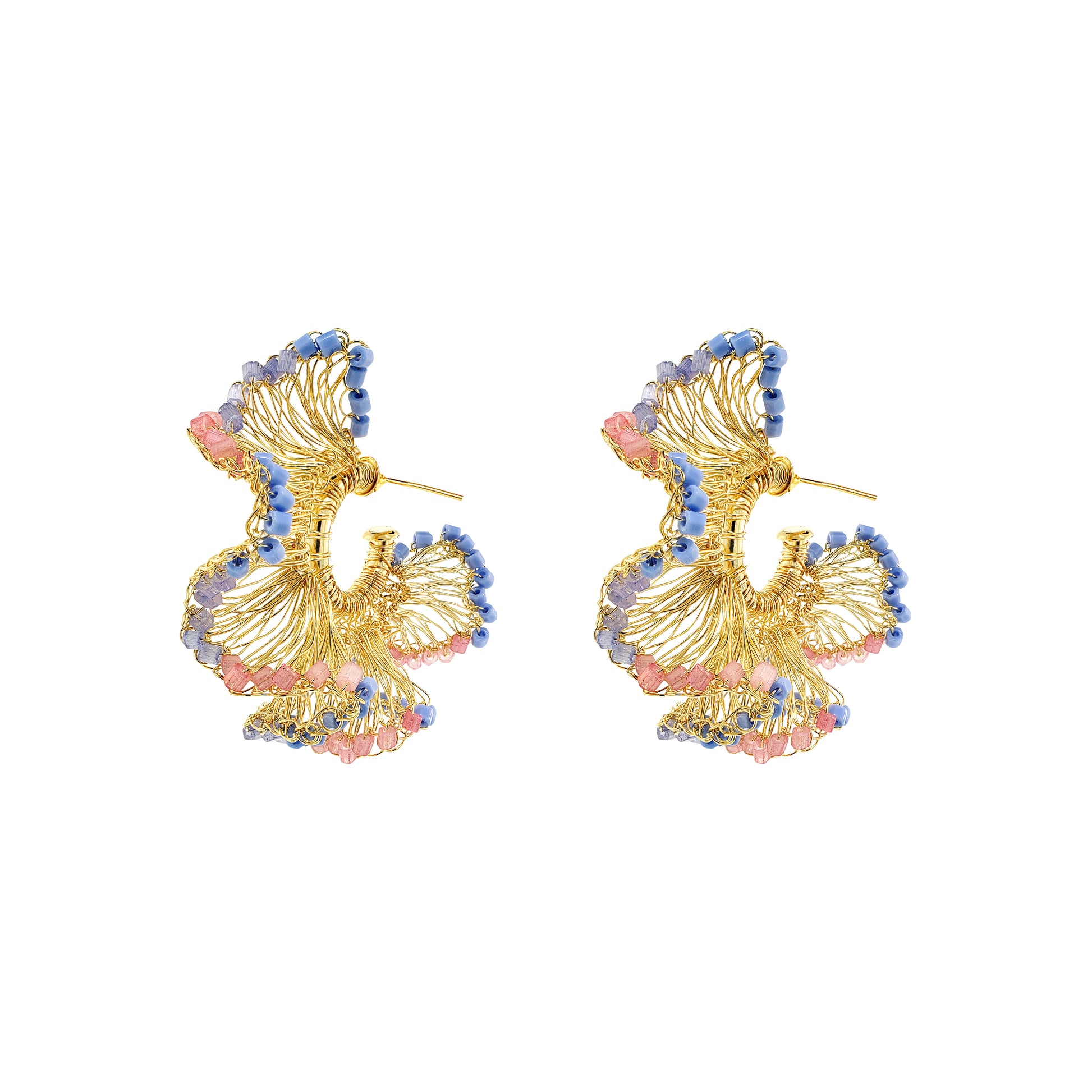 These fun ruffled, hand-crocheted hoops were fabricated by highly skilled Brazilian artisans. They feature 18 karat gold-filled copper wire and a rich combination of crystals in pink and blue tones that create a statement look without the weight or bulk! These are very comfortable to wear and perfect for every occasion, from day to day use or even a more special celebration! Made from non-allergenic (hypoallergenic) and nickel-free. Stunning jewelry that will last for a lifetime. Each pair of earrings takes hours to finish. The result is a remarkable piece of jewelry. This piece is 100% Hand Crocheted made with 18k Gold filled wire in Brazil.