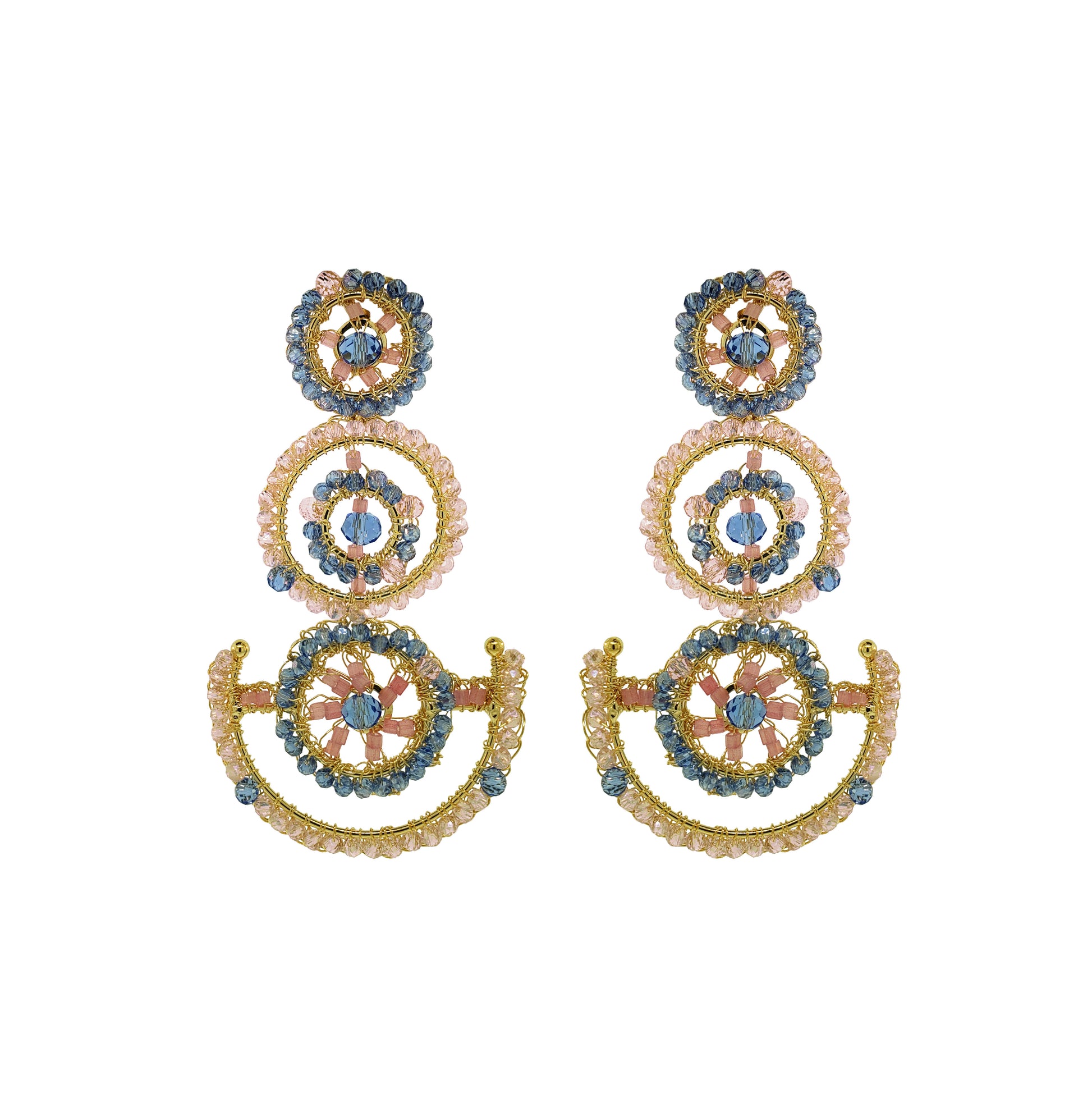 These striking handmade maxi cascade earrings are crafted by skilled Brazilian artisans using 18 Karat Gold Filled Wire and dazzling mix of crystals in pink and blue tones. The intricate crochet design blends circular and geometric shapes, creating a modern and elegant statement piece. Lightweight, hypoallergenic, and nickel-free — these earrings combine craftsmanship, comfort, and timeless beauty. Stunning jewelry that will last for a lifetime.