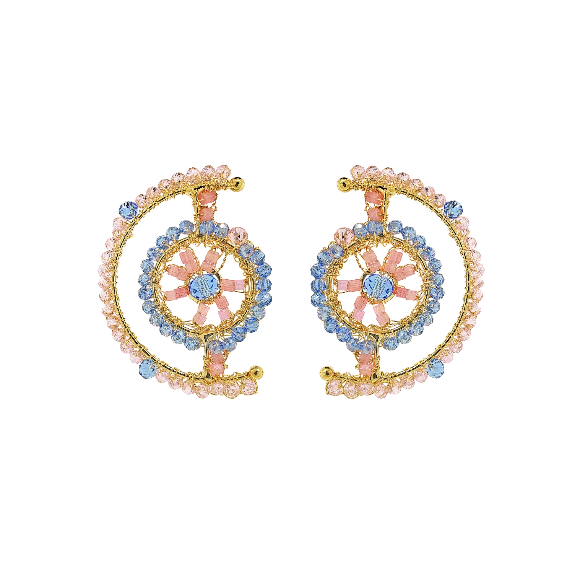 These striking handmade earrings are crafted by skilled Brazilian artisans using 18 Karat Gold Filled Wire and dazzling mix of crystals in pink and blue tones. The intricate crochet design blends circular and geometric shapes, creating a modern and elegant statement piece. Lightweight, hypoallergenic, and nickel-free — these earrings combine craftsmanship, comfort, and timeless beauty. Stunning jewelry that will last for a lifetime.