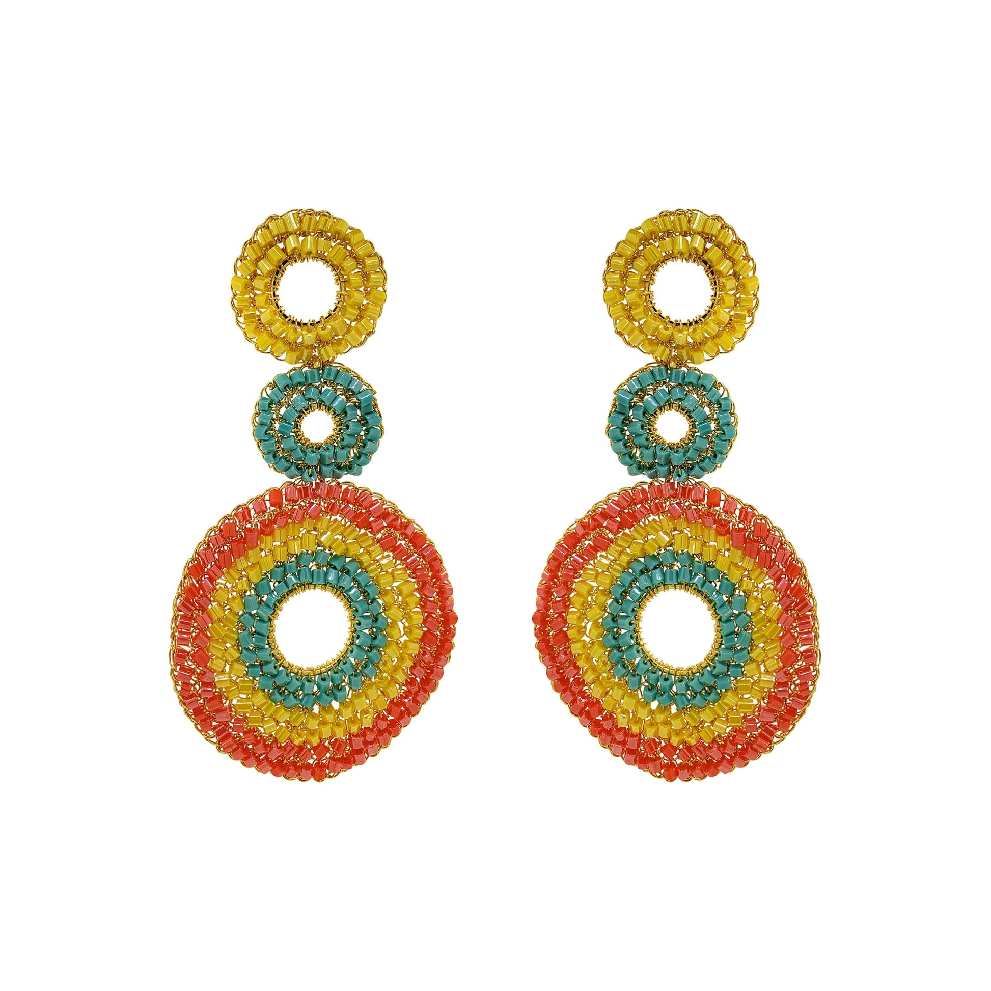 These triple mandala, hand-crocheted cascade earrings were created by skilled Brazilian artisans. They are made with 18 Karat Gold Filled Wire and they make a statement without the weight or bulk! Made with hypoallergenic materials and nickel-free. Stunning jewelry that will last for a lifetime.