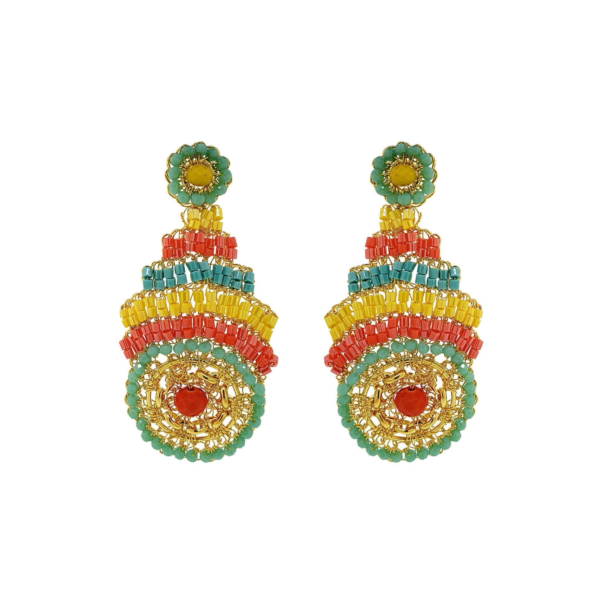 These handmade pieces are made of 18 karat gold filled copper wire with a gorgeous combination of shiny crystals stitched into a beautiful pair of earrings . Made from hypoallergenic and nickel-free materials. Stunning jewelry that will last for a lifetime.