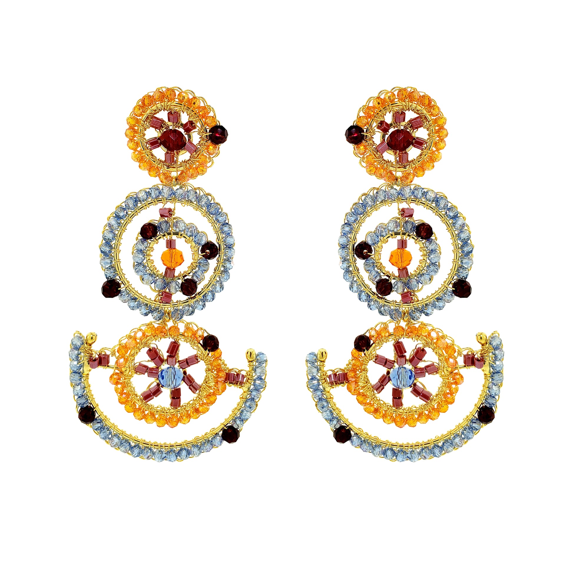 These striking handmade maxi cascade earrings are crafted by skilled Brazilian artisans using 18 Karat Gold Filled Wire and dazzling mix of crystals in warm sunset tones — amber, red, and light blue. The intricate crochet design blends circular and geometric shapes, creating a modern and elegant statement piece. Lightweight, hypoallergenic, and nickel-free — these earrings combine craftsmanship, comfort, and timeless beauty. Stunning jewelry that will last for a lifetime.
