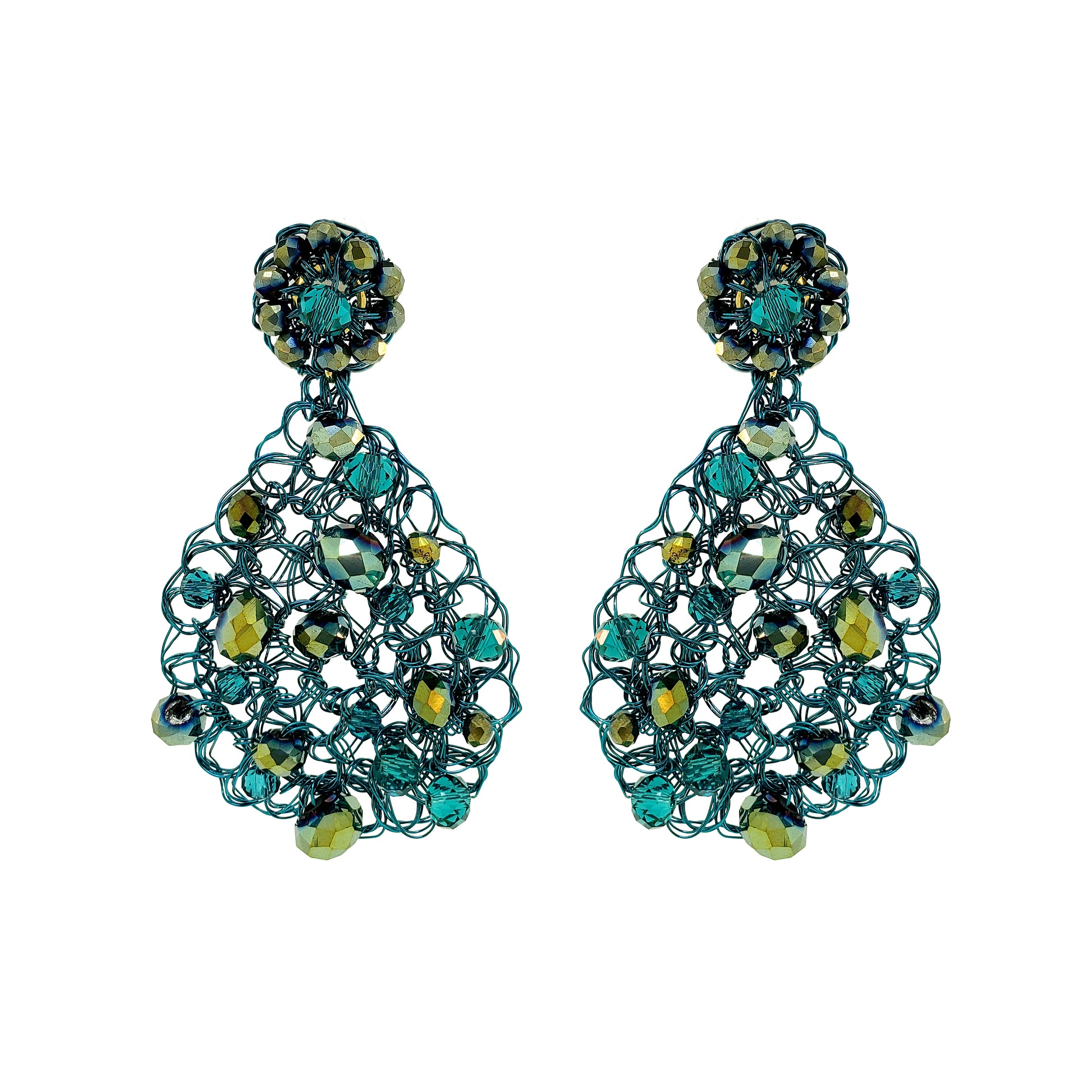 These teardrop-shaped, hand-crocheted mesh earrings were created by highly skilled Brazilian artisans. They feature shiny enameled copper wire creating a stunning look without the weight or bulk! They are light, comfortable, and can be worn on any occasion. The sparkling crystals complement the fine handiwork that can be seen in all of my jewelry. Made from hypoallergenic and nickel-free materials. Stunning jewelry that will last for a lifetime. This piece is entirely hand-crocheted, enameled copper wire, made in Brazil and includes a beautiful velvet bag.