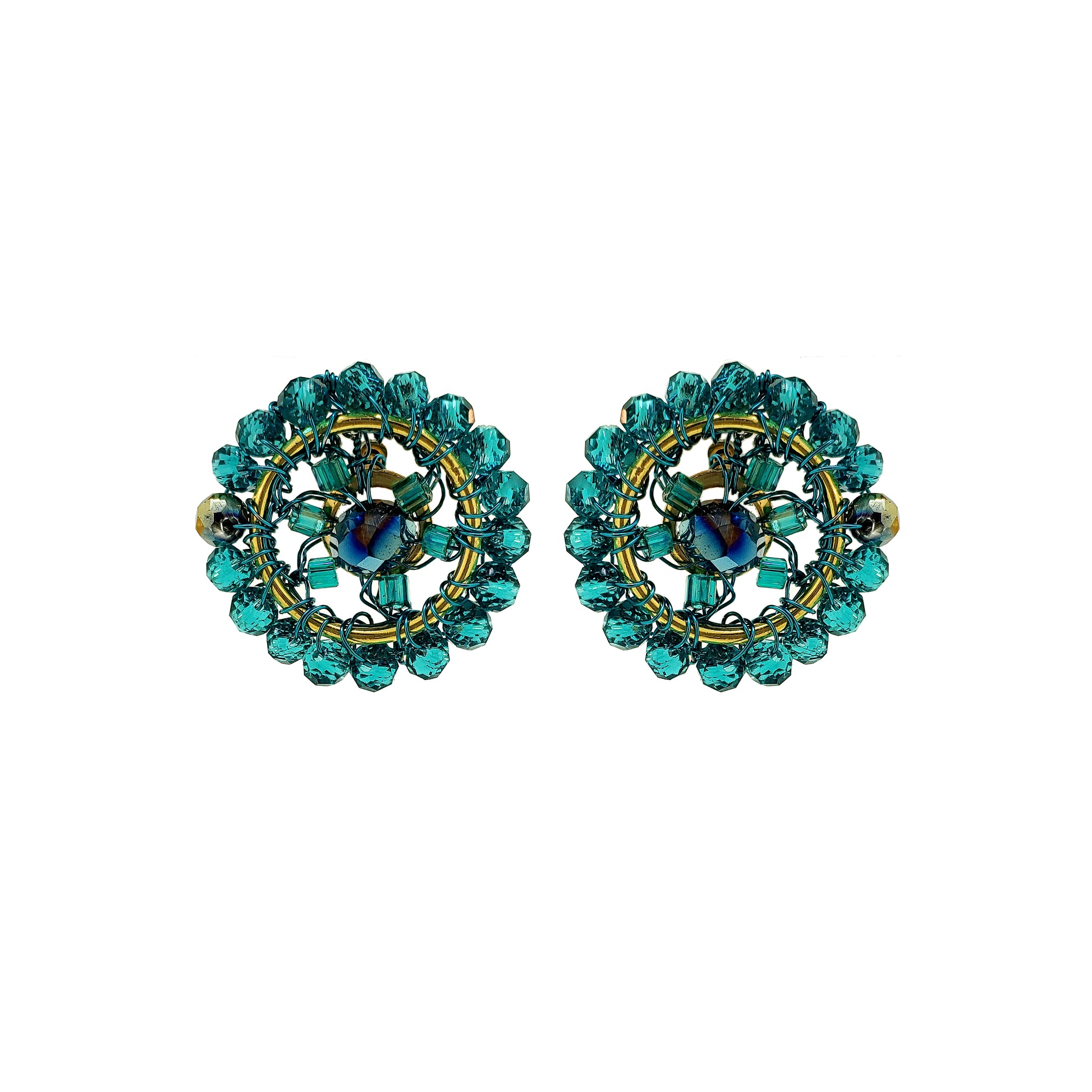 These striking handmade mini earrings are crafted by skilled Brazilian artisans using enameled wire and dazzling turquoise and teal crystals. The intricate crochet design blends circular and geometric shapes, creating a modern and elegant statement piece. Lightweight, hypoallergenic, and nickel-free — these earrings combine craftsmanship, comfort, and timeless beauty. Stunning jewelry that will last for a lifetime.