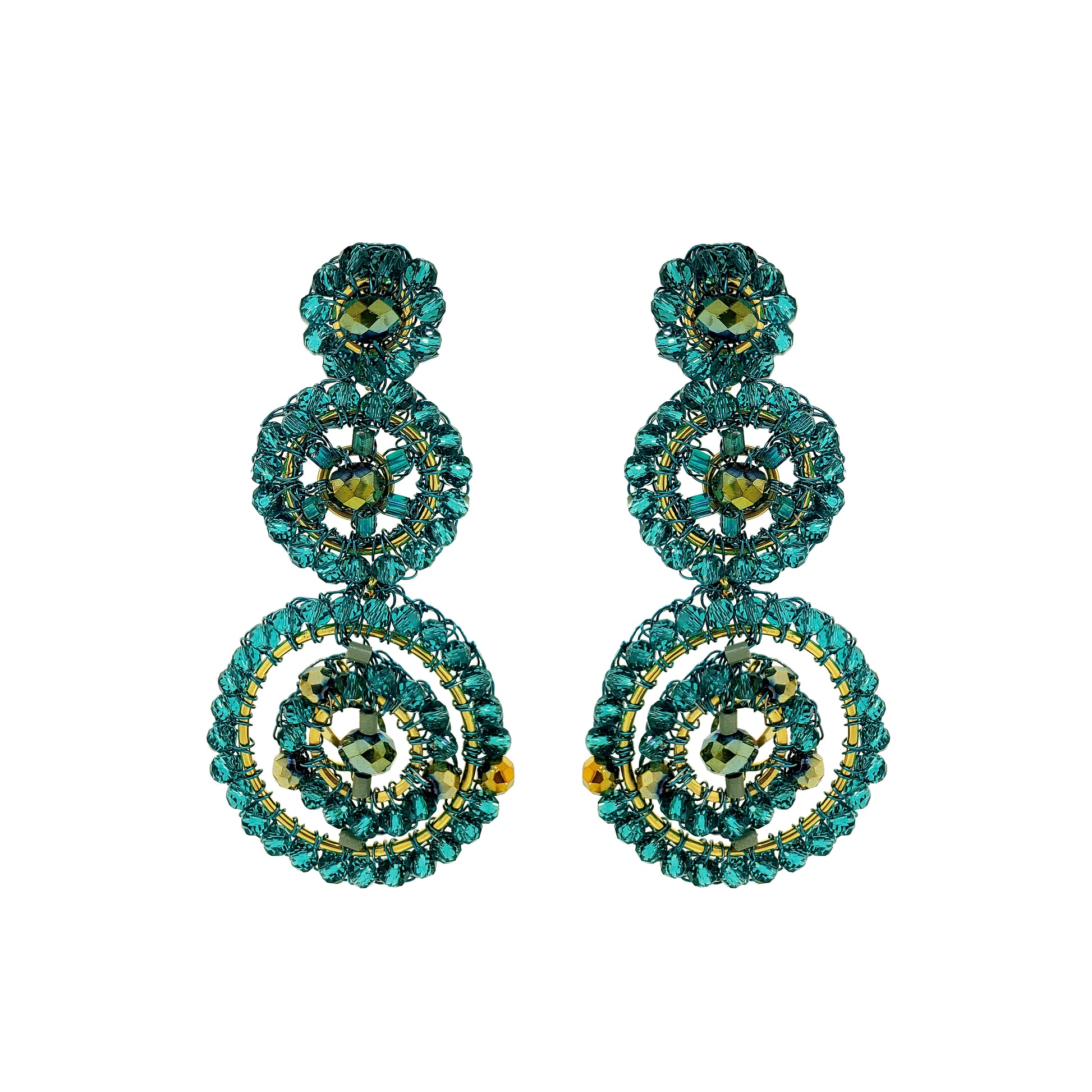 These striking handmade cascade trio earrings are crafted by skilled Brazilian artisans using enameled wire and dazzling turquoise and teal crystals. The intricate crochet design blends circular and geometric shapes, creating a modern and elegant statement piece. Lightweight, hypoallergenic, and nickel-free — these earrings combine craftsmanship, comfort, and timeless beauty. Stunning jewelry that will last for a lifetime.