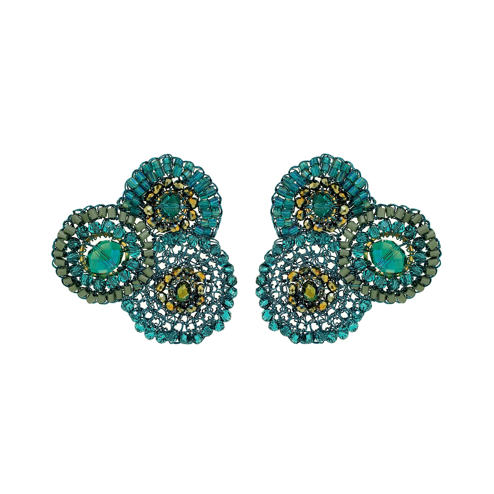 These stunning handmade maxi posts are crafted by talented Brazilian artisans using enameled wire and a rich combination of crystals in teal tones. Their circular design radiates warmth and sophistication, making them a perfect statement piece for any occasion. Made from hypoallergenic and nickel-free materials, these earrings beautifully blend artistry, color, and craftsmanship. Stunning jewelry that will last for a lifetime.