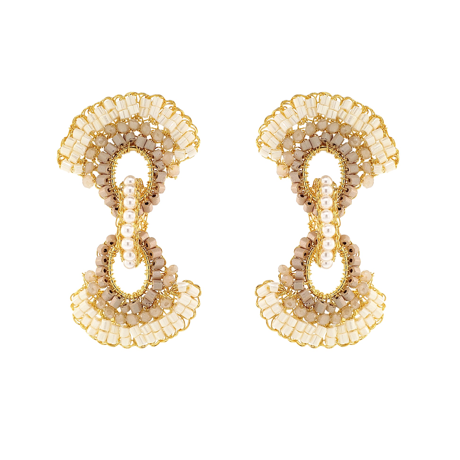 These hand-crocheted earrings were created by highly skilled Brazilian artisans. These shining earrings make a statement without the weight or bulk. They are light, comfortable, and can be worn on any occasion. The sparkling frosty crystals complement the fine handiwork that can be seen in all of my jewelry. Made from hypoallergenic and nickel-free materials. Stunning jewelry that will last for a lifetime. This piece is entirely hand-crocheted, 18 karat Gold Filled made in Brazil.